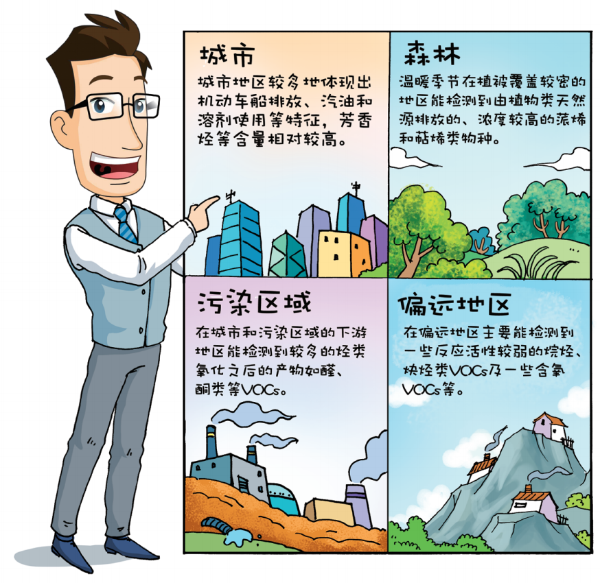 空氣中的VOCs受到排放、輸送、化學(xué)反應(yīng)等多種因素的影響。因此,不同地區(qū)可觀測(cè)到的VOCs種類會(huì)有所不同。通常,城市地區(qū)較多地體現(xiàn)出機(jī)動(dòng)車船排放、汽油和溶劑使用等特征,芳香烴等含量相對(duì)較高;溫暖季節(jié)在植被覆蓋較密的地區(qū)能檢測(cè)到由植物類天然源排放的、濃度較高的蒎烯和萜烯類物種;在城市和污染區(qū)域的下游地區(qū)能檢測(cè)到較多的烴類氧化之后的產(chǎn)物如醛、酮類等VOCs;在偏遠(yuǎn)地區(qū)主要能檢測(cè)到一些反應(yīng)活性較弱的烷烴、炔烴類VOCs及一些含氧VOCs等。