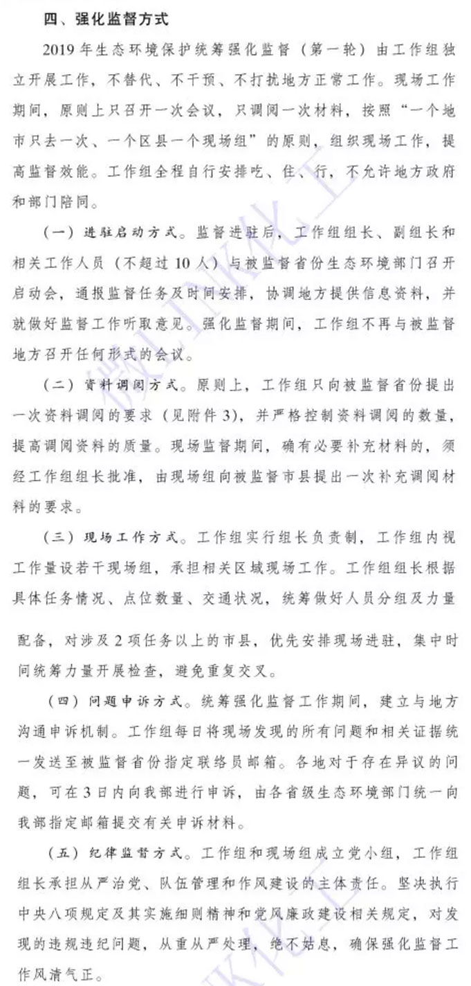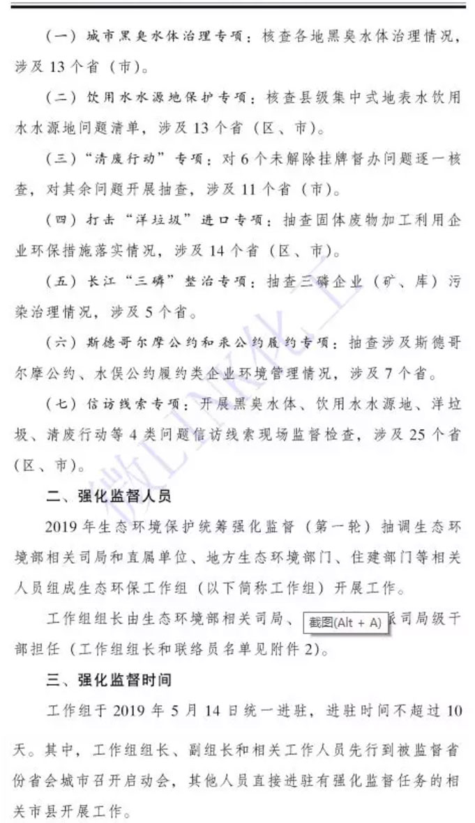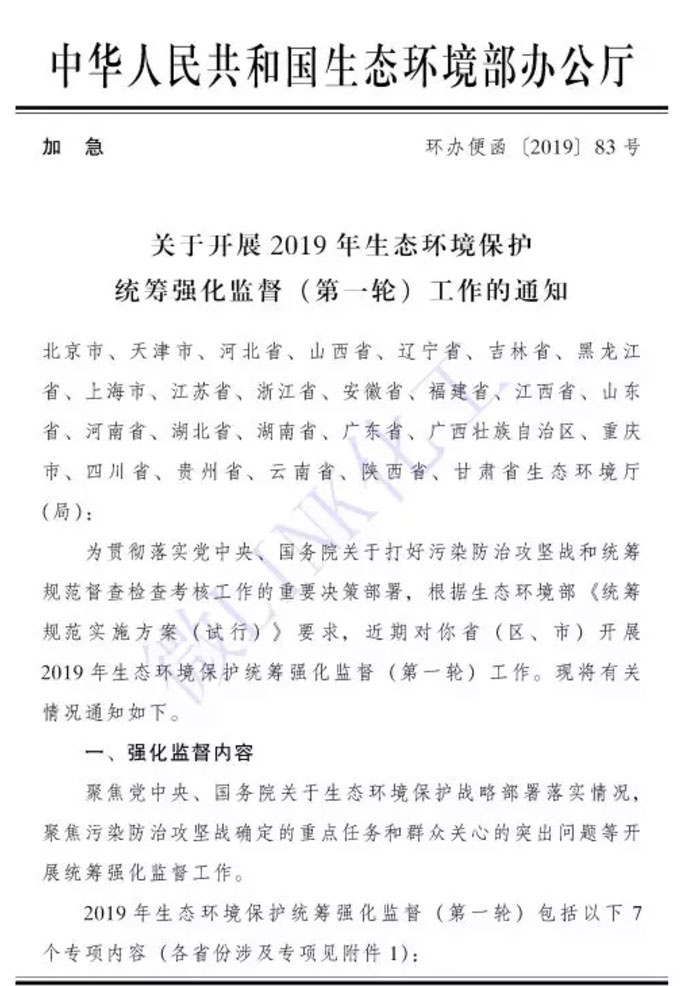 近期,生態(tài)環(huán)境部根據(jù)《統(tǒng)籌規(guī)范實施方案(試行)》要求,將對25個省市、自治區(qū)開展2019年生態(tài)環(huán)境保護(hù)統(tǒng)籌強(qiáng)化監(jiān)督。主要是對黨中央、國務(wù)院關(guān)于生態(tài)環(huán)境保護(hù)戰(zhàn)略部署落實情況、污染防治攻堅戰(zhàn)確定的重點任務(wù)和群眾關(guān)心的突出問題等工作進(jìn)行監(jiān)督檢查,涉及城市黑臭水體治理、飲用水水源地保護(hù)、“清廢行動”、打擊“洋垃圾”進(jìn)口、斯德哥爾摩公約和汞公約履約、信訪線索等專項檢查行動。此次統(tǒng)籌強(qiáng)化監(jiān)督抽調(diào)水體環(huán)境部相關(guān)司局和直屬單位、地方生態(tài)環(huán)境部門、住建部門等相關(guān)人員組成生態(tài)環(huán)保工作組,工作組獨立開展工作,實行工作組組長負(fù)責(zé)制,成立若個現(xiàn)場組,承擔(dān)相關(guān)地方現(xiàn)場監(jiān)督檢查工作。
