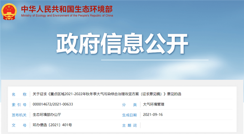 為深入打好污染防治攻堅戰,持續改善重點區域秋冬季環境空氣質量,生態環境部起草了《重點區域2021-2022年秋冬季大氣污染綜合治理攻堅方案(征求意見稿)》。要求于2021年9月22日前反饋。